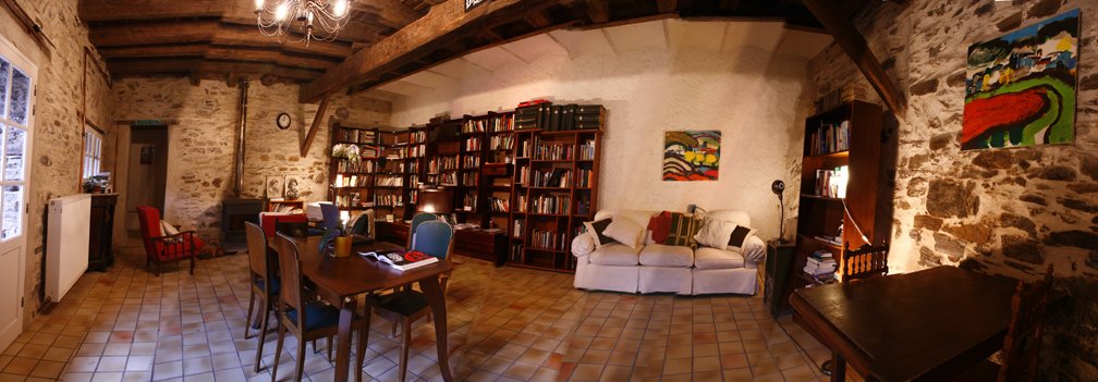 Our living library is on the terrace level of La Muse and is a very spacious room with authentic stone walls - the mountain, huge hand-hewn beams, and a tile floor. The reason we call it a living library is because every retreat the library grows when new residents/attendees donate two or more books to it. These books are always books which have inspired people to write, paint or compose and/or books about where they are from physically and artistically. As you can guess this means La Muse is blessed with many amazing books as they are either written by the people who have been here or are inspired by their friends or home muses! Please check out our blog here to see who has been donating books to the library. For more on our library collection click here.